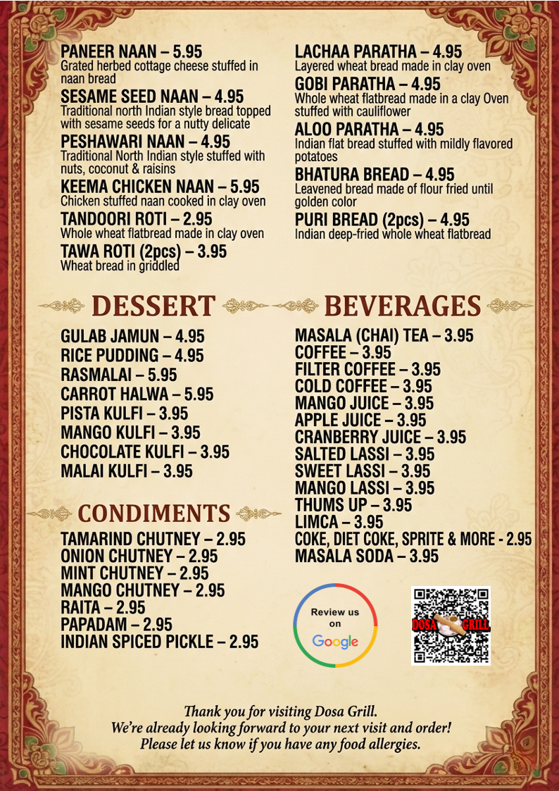 The beverage options at Dosa Grill Vestal are refreshing and complement the spicy dishes. You can enjoy a traditional Masala Chai or Filter Coffee, or opt for something cool like Cold Coffee or Mango Juice. Don’t forget to pair your meal with their flavorful Condiments such as Tamarind Chutney, Mint Chutney, and Raita.