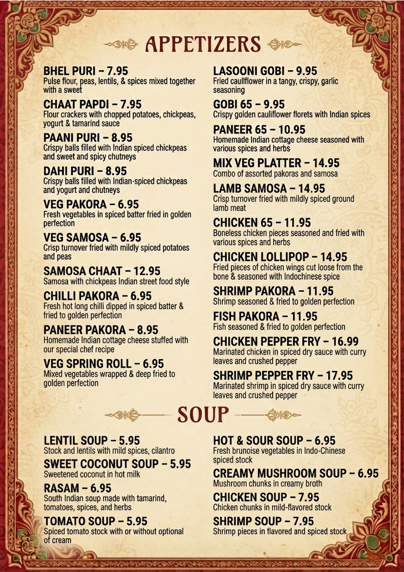 For those who enjoy soups, the restaurant offers several comforting choices, including Lentil Soup, Sweet Coconut Soup, and the tangy Rasam Tomato Soup, alongside the ever-popular Hot & Sour Soup.