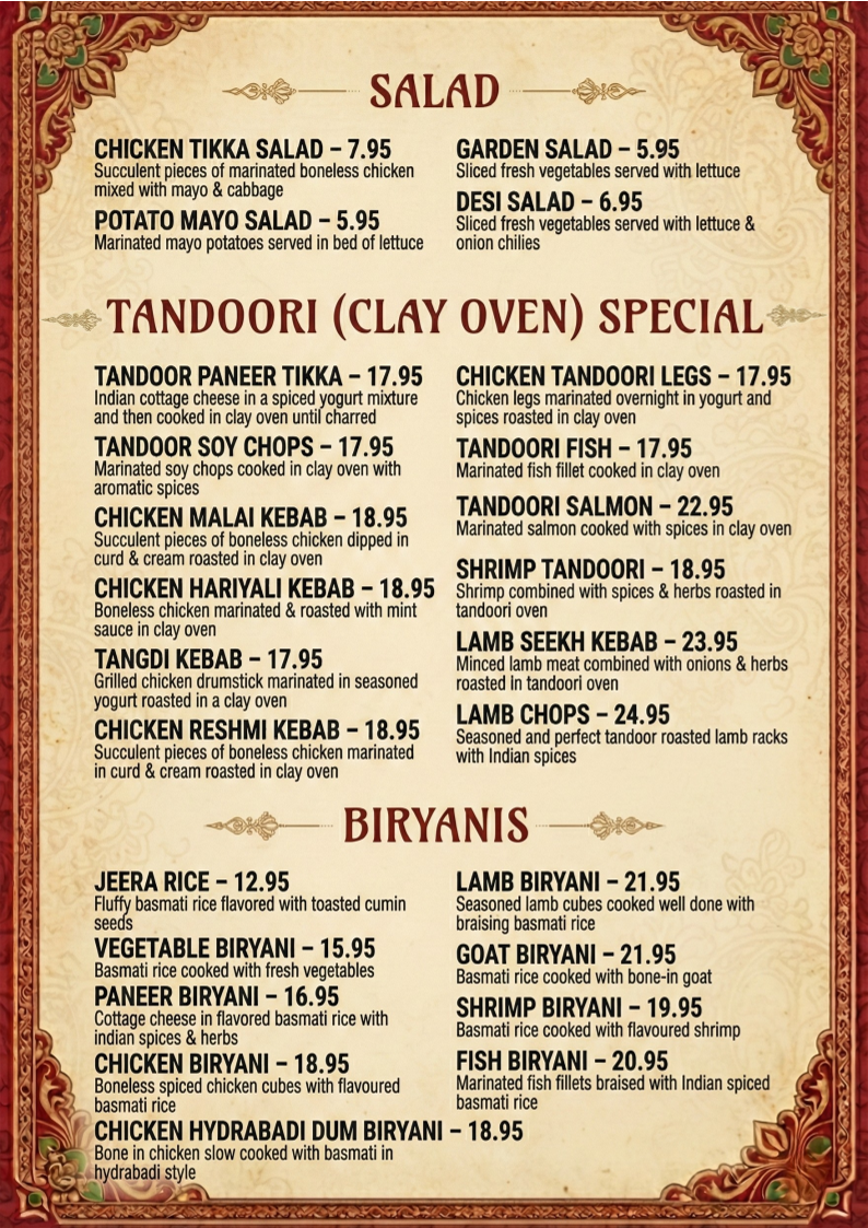 The Salad options are a mix of fresh and flavorful dishes, with choices like Chicken Tikka Salad and Potato Mayo Salad. The Desi Salad and Garden Salad also provide lighter, refreshing alternatives for those looking for a healthier option.