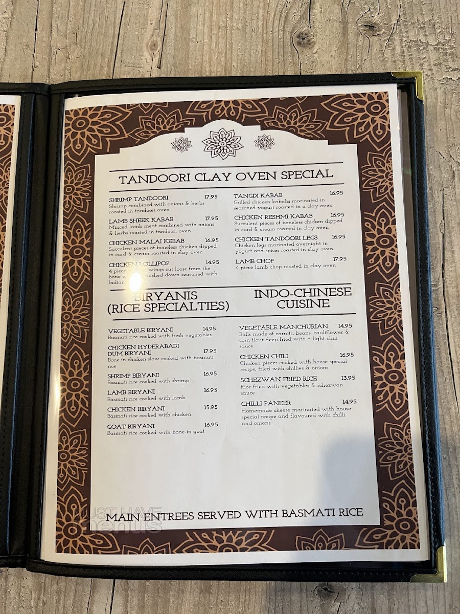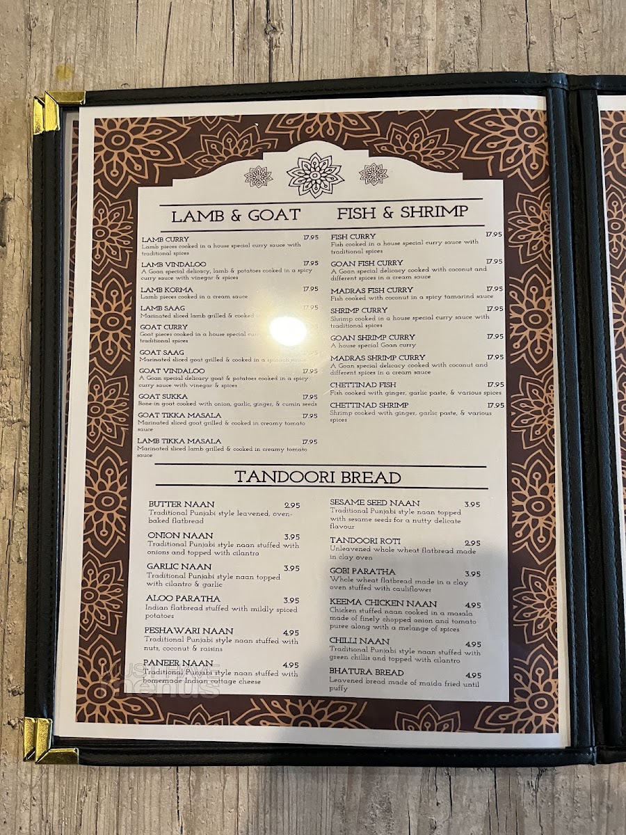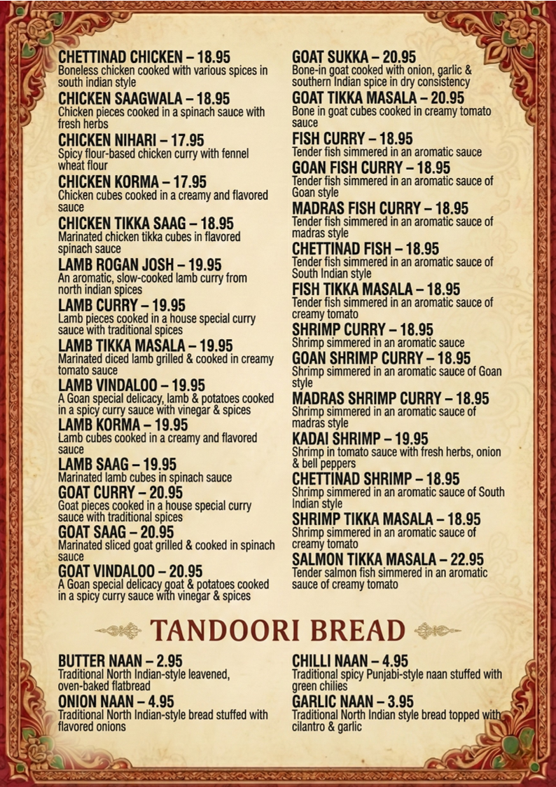 The Tandoori Breads are the perfect accompaniment to any curry, with options like Butter Naan, Onion Naan, Chili Naan, and Garlic Naan, or the indulgent Paneer Naan.